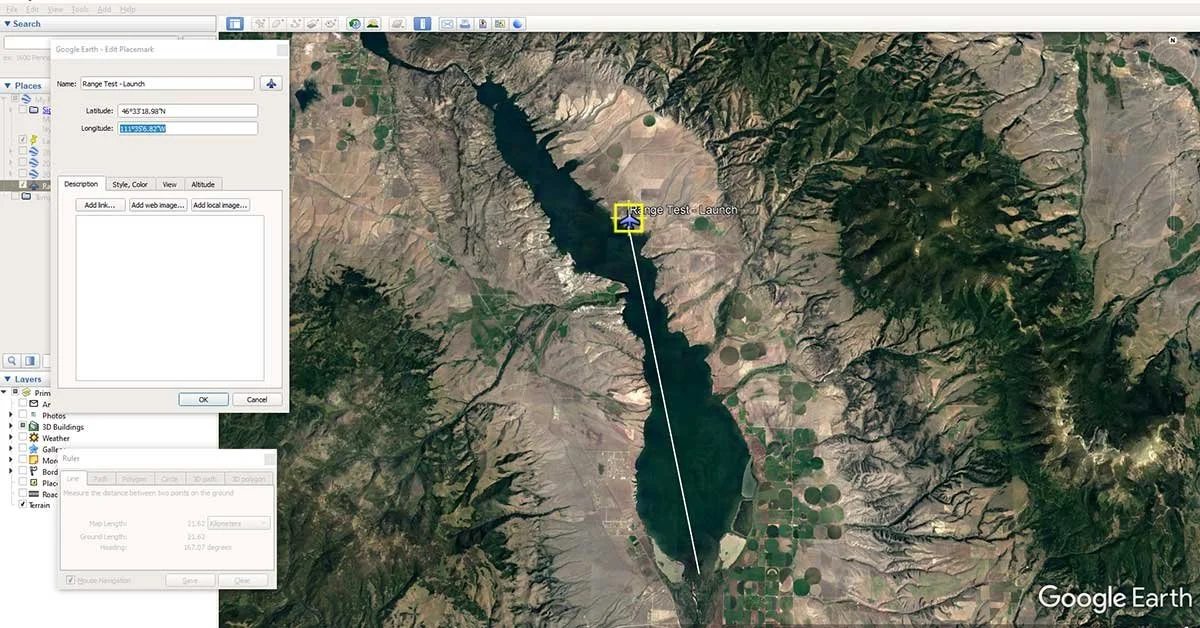 This lake was an ideal location to conduct the range test. The launch location was in a direct line of sight to the end of the lake, 19 km away.