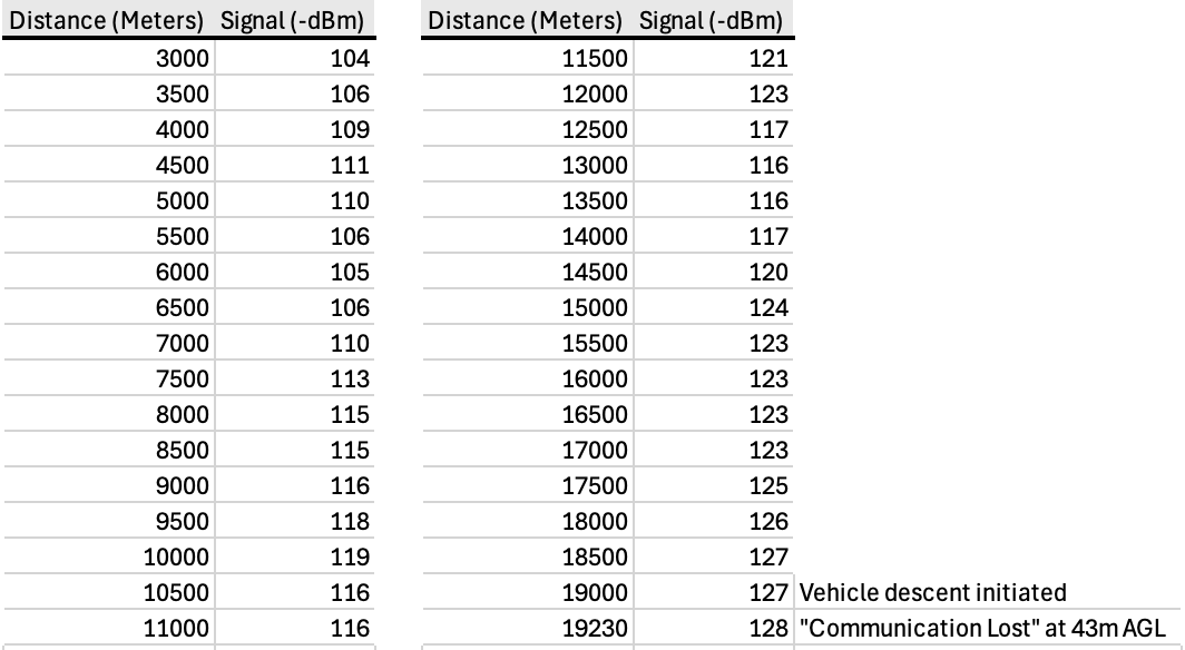 The results of this test also challenged our assumptions that a signal of less than -90 dbm would be unusable. To the contrary, the Herelink and drone communicated well between the range of -90 dbm and -130 dbm.